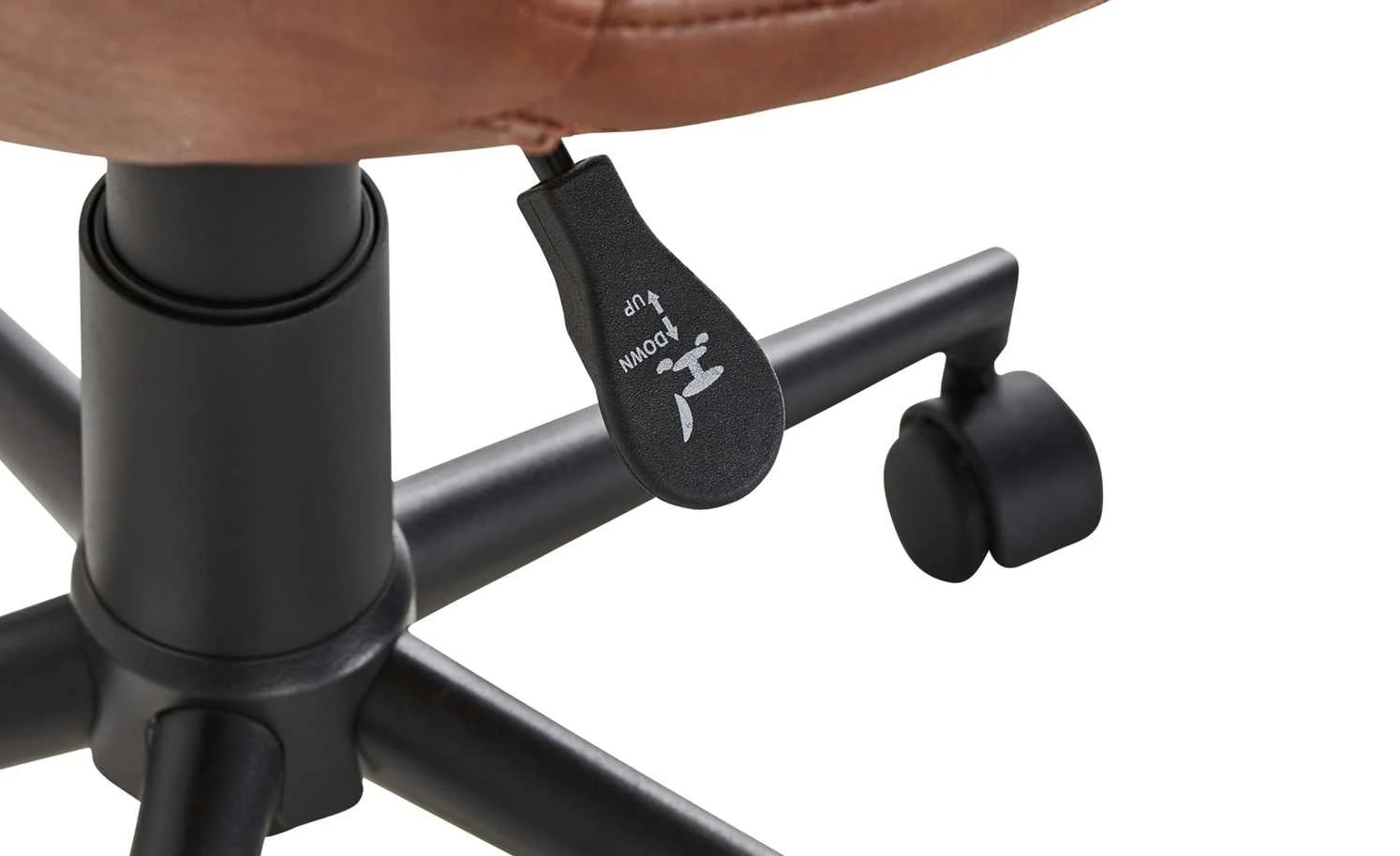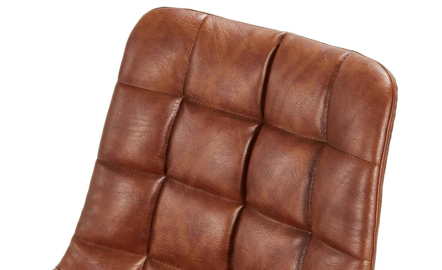 Für den heimischen Schreibtisch braucht es auch einen passenden Stuhl. So wie den Bürodrehstuhl Anglin. Die gesamte Sitzschale ist weich gepolstert und mit braunem Kunstleder bezogen. Die gesamte Vorderseite ist quadratisch gesteppt. Dank des kleinen Hebels unter der Sitzfläche können Sie den Drehstuhl in der Höhe verstellen. Das ist von 42 bis 50 Zentimeter möglich.