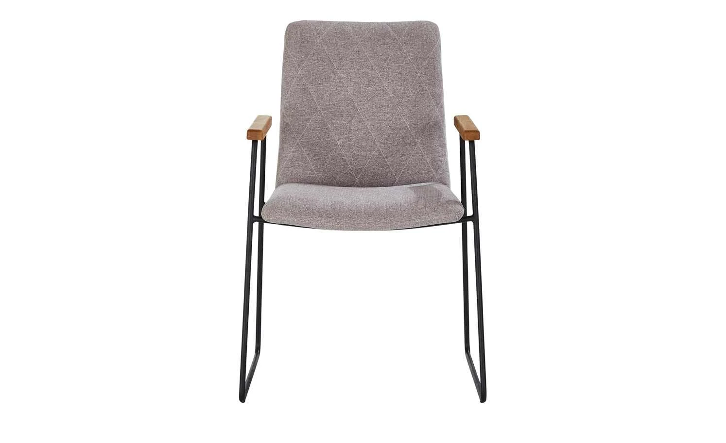 Der Kufenstuhl Samu spielt mit geometrischen Formen. Seine trapezförmigen schwarzen Metallkufen wirken minimalistisch und modern. Sie lassen die dick gepolsterte Sitzschale scheinbar schweben. Der pflegeleichte Bezugsstoff ist an der Rückenlehne rautenförmig gesteppt: Und das beidseitig. Aus den verlängerten Metallkufen entspringen zwei Armlehnen. Sie sind aus echtem Eichenholz, welches zum Schutz lackiert wurde. Samu vereint Komfort und Design und wird so zu einem attraktivem Charakterstuhl mit Retro-Note.