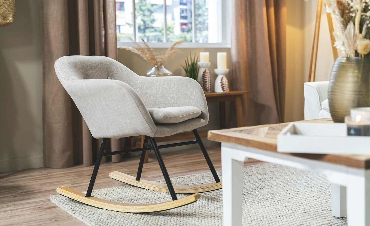 Bequem Sitzen und beim Schaukeln entspannen – das können Sie mit dem Schaukelsessel Rocco. Die Sitzschale ist weich gepolstert und zusätzlich mit einem weichen Sitzkissen ausgestattet. Rückenlehne und beide Armlehnen haben eine angenehme, bequeme Höhe. Für den Bezug ist ein dekorativer grau melierter Webstoff verwendet worden. Das Gestell besteht aus stabilem Metall und hat einen matten schwarzen Farbton. Beide Kufen sind mit Birkenholz furniert und haben Filzgleiter auf der Unterseite. Sie sollen den Boden vor Abnutzungen schützen.