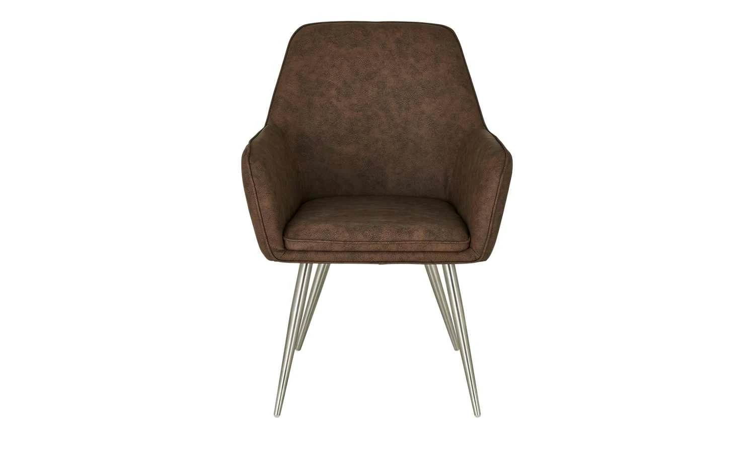 Für ein bequemes Sitzgefühl bei Tisch sorgt der Stuhl Ilvie von uno. Er verfügt über eine hohe Rückenlehne und Armlehnen in Komforthöhe. Zudem ist die gesamte Sitzschale weich mit Schaumstoff gepolstert. Für den Bezug ist ein robustes Kunstleder in Braun verwendet worden. Es hat einen dekorativen Keder, also eine dickere Randverstärkung. Vier Stuhlbeine aus gebürstetem Edelstahl sorgen für einen guten Stand des Stuhls.